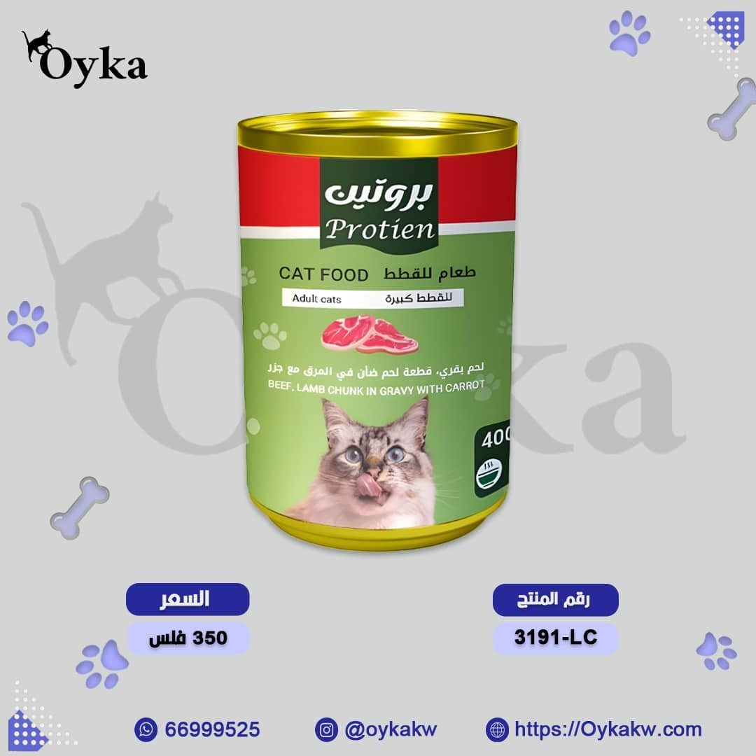 طعام للقطط الكبيرة من بروتين لحم بقري قطعة لحم ضان بالمرق مع جزر Food for Adult cats with protein: beef, lamb chop in gravy with carrots